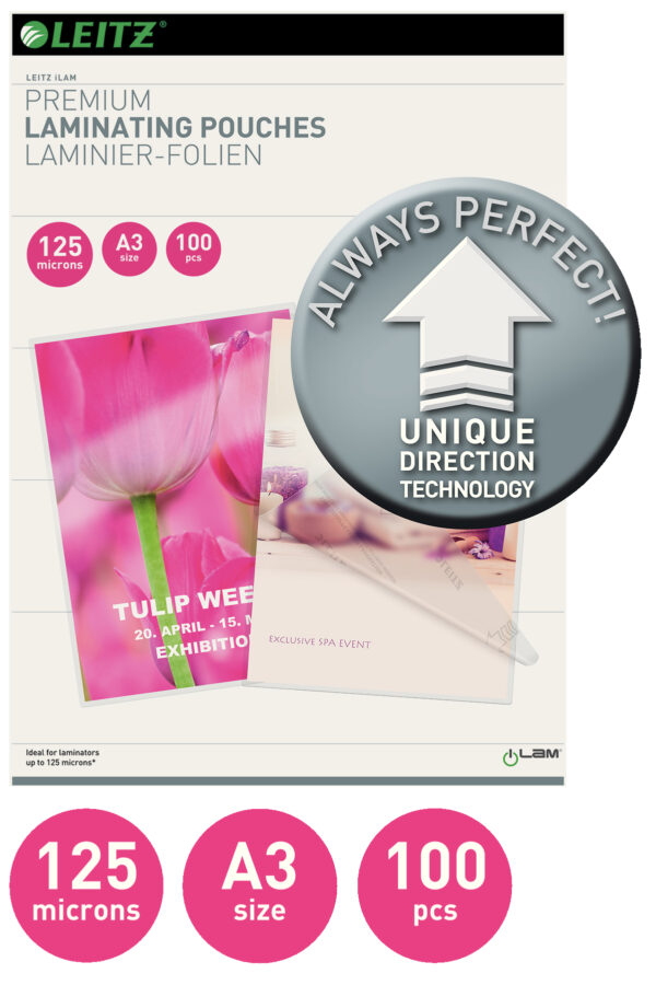 #Usor de folosit, cu UDT (Unique Direction Technology)- un sistem unic cu sageti ce indica directia corecta de introducere a foliei de laminator si dispar dupa laminare. #Instructiuni de utilizare usor de urmat, pentru o laminare perfecta, fara blocaje. #Finisaj lucios pentru intensificarea culorilor. #Protectie de durata a documentelor impotriva murdariei, lichidelor si umezelii, rigiditate mare. #Potrivite pentru toate laminatoarele. #Grosime: 125 microni. #Format: A3. #Dimensiuni: 303 x 426 mm. #Ambalare: 100 folii/top.