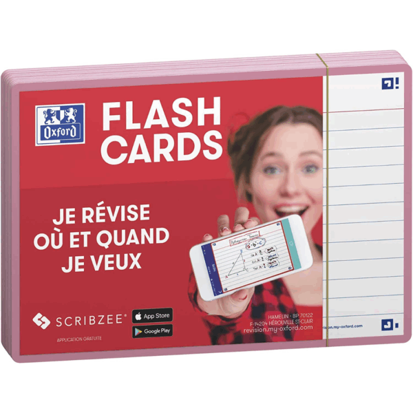 # Oxford Flash Cards este un set de 80 de cartonase pentru notite, concepute pentru a ajuta utilizatorii sa invete si sa-si consolideze cunostintele intr-un mod distractiv si interactiv. # Fiecare set contine 4 pachete de 20 de cartonase, cu dimensiunea de A6 (105 x 148 mm), astfel incat sa fie usor de utilizat si de depozitat. # Ideale pentru a crea liste de cuvinte sau pentru a scrie note si informatii importante. # Aceste cartonase sunt echipate cu Scribzee, o aplicatie mobila gratuita, care le permite utilizatorilor sa scaneze si sa organizeze notitele intr-un mod digital, astfel incat sa fie mai usor sa le acceseze si sa le utilizeze mai tarziu. # Culoare margini: roz.