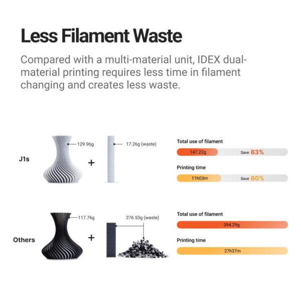 Imprimanta 3D Snapmaker J1S, Idex, doua capete de printare independente, Tehnologi; FFF(Fused Filament Fabrication), Volum printareDefault mode 300 x 200 x 200mm, Copy Mode: 160 mm ? 200 mm ? 200 mm, Mirror Mode: 150 mm ? 200 mm ? 200 mm, Inaltime strat: 0.05-0.3mm, Platforma printare: Sticla PEI, Temperatura maxima platforma: 100?C, Diametru duza inclusa: 0.4mm, temperatura maxima duza: 300?C, Diematru filament: 1.75mm, Filament compatibil: PLA, ABS, HIPS, PC, TPU (Hardness ? 90 Shore A), TPE, PETG, ASA, PP, PVA, PA, PA-GF, PA-CF, Interfata: Wi-Fi, USB cable, USB flash drive, Nivel zgomot: