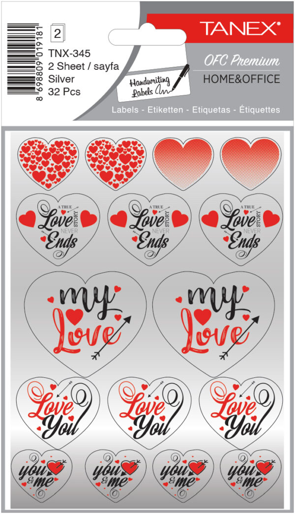 Stickere decorative, 2 file/set, TANEX Kids – inimi – argintii, TNX 345