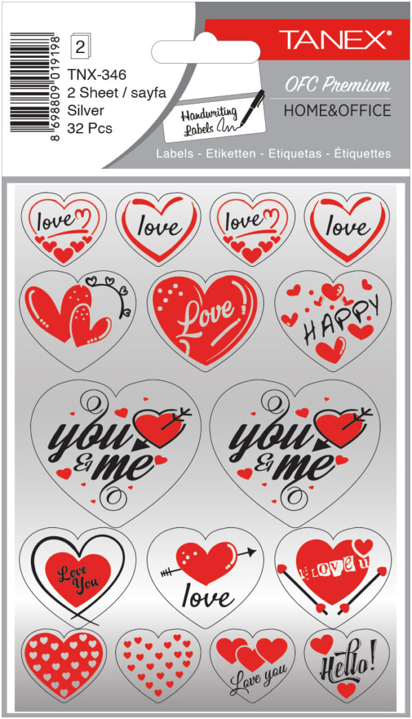 Stickere decorative, 2 file/set, TANEX Kids – inimi – argintii, TNX 346