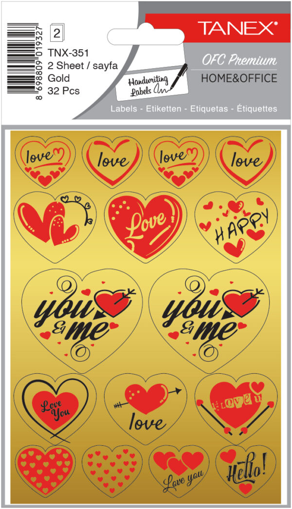 Stickere decorative, 2 file/set, TANEX Kids – inimi – aurii, TNX 351