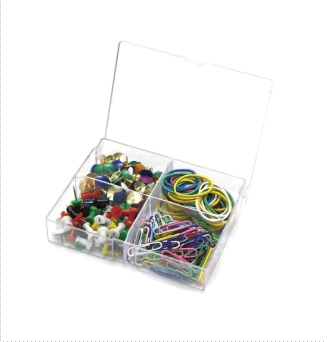 # Cutie din plastic transparent cu 4 compartimente; # 1 compartiment cu 15 g elastice; # 1 compartiment cu 120 agrafe de birou; # 1 compartiment cu 50 pioneze culori asortate pentru panou pluta; # 1 compartiment cu 125 pioneze culori asortate.